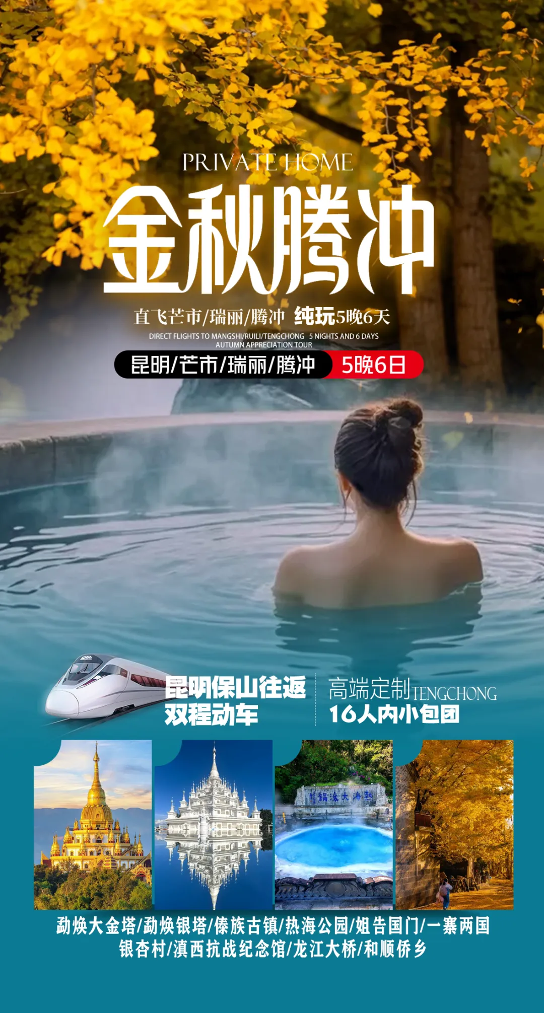 门票XMJ16人小团【金秋腾冲】芒市瑞丽腾冲6日游(一价全含0自费)酒店,版权所有,侵权必究   昆明进出:昆明动车—保山—芒市  芒市进出:半天芒市自由活动  勐焕大金塔—勐焕银塔—入住芒市酒店