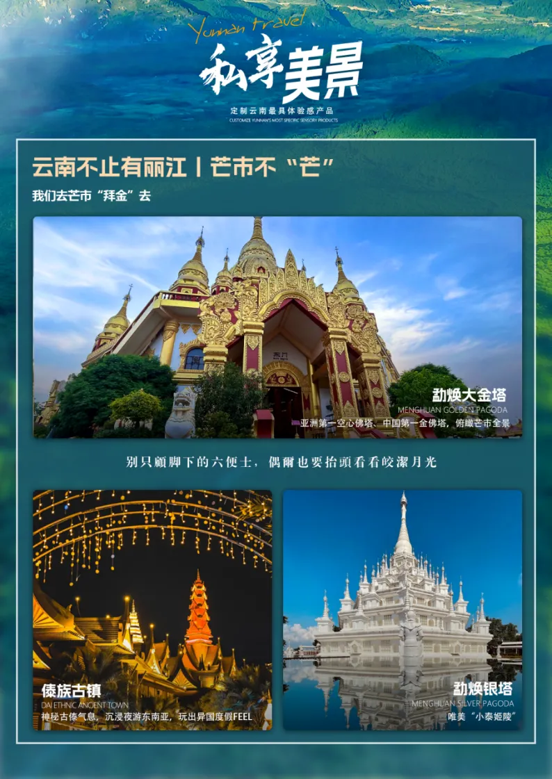昆明进出:昆明动车—保山—芒市  芒市进出:半天芒市自由活动  勐焕大金塔—勐焕银塔—入住芒市酒店门票XMJ16人小团【金秋腾冲】芒市瑞丽腾冲6日游(一价全含0自费)酒店,版权所有,侵权必究